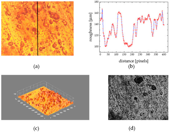 (a): A microscopic image of Al flat surface (reference) covered with a marine biofilm (14-day old), collected in Baltic sea water (Gulf of Gdańsk, Poland; August, 2018); (b): roughness height profile along the line from (a), (c): 3D surface morphology from (a) derived with ImageJ routine, (d): (a) processed with “find edges” procedure; covered area x = 660 and y = 520 μm. Distance scale 180 pixels = 50 μm; morphology parameters: surface coverage f = 28.7%, mean thickness = 9 μm, biovolume = 24,500 μm3, roughness fluctuation coefficient η = 0.141, fractal dimension = 1.16, Hopkin’s aggregation index = 2.14, AC = 0.25.