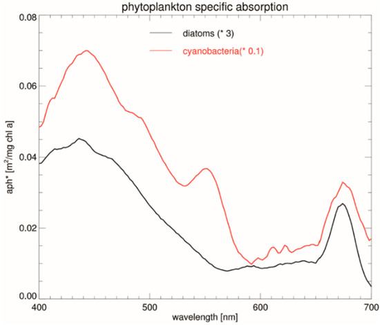 The spectra of pigment-specific phytoplankton absorption determined in marine water samples (reproduced after [42]). Symbols: cyanobacteria (red) and diatoms (black).