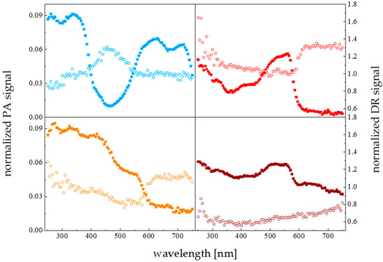 The spectral light absorption features of the PVC colored deposition plates were determined with the photoacoustic spectroscopy (PAS) technique using a closed–type photoacoustic cell system, as described elsewhere [43]. The photoacoustic-based modalities allowed the spectral signatures of opaque materials to be determined. In addition, apart from a standard photoacoustic spectroscopy approach (PA), an alternative methodology based on the diffusive reflectance mode (DR) was used here to evaluate the spectral characteristics of the light beam reflected back from the solid sample [44]. The PAS absorption (squares) and PAS reflectance (circles) mode (DR) spectra, for PVC solid surfaces of different colors are shown in Figure 9.