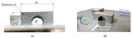 The amount of RS was estimated using the bridge curvature method (BCM), in which one of the two pillars of the bridge-shaped specimens was cut out by electro-discharge machining, and the deflection of the top surface was measured (Figure 2a). The BCM is widely used in PBF and allows a qualitatively asses process parameters and their direct effect on RS through deformation of the part [26,27]. The BCM specimens were produced directly on the build platform in the transverse (90°) and longitudinal (0°) directions corresponding to the direction of the powder recoating (Figure 2b). The geometry of the top surface was measured in each state using an optical 3D scanner Atos TripleScan 8M (GOM GmbH, Braunschweig, Germany). Data of the top surface deformation were determined as a mean value of the three virtual sections at a distance of 2.5 mm from each other. The virtual sections are shown in Figure 2b as red dotted lines on the top surface of one specimen.