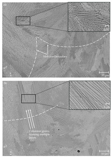Light microscopy images in the XZ plane showed arch-shaped lines resulting from a uniformly shaped melt pools during the process (Figure 4a) as well as visible laser trajectories in the XY plane (Figure 4b). This macrostructure is typical for alloys produced by LPBF [29]. The mean width of the melt pool on the etched specimens was measured as part of the macrostructural evaluation. The mean width of the melt pool was determined to be 88.5 μm for the RT specimen, 101.7 μm for 200 °C, and 123.4 μm for the specimen preheated at 400 °C. Figure 5a,b shows the details of the microstructure of the RT and specimens preheated at 400 °C in the XZ plane. The observed microstructure was characterised by a very fine cellular/dendritic structure with columnar grains in several melt pools elongated along the build direction. Some melt pools showed the presence of columnar grains growing in the direction of the thermal gradient (parallel to the build direction). Several columnar grains pass through a few melt pools (Figure 5b), which leads to strong bonding between the individual layers [11].