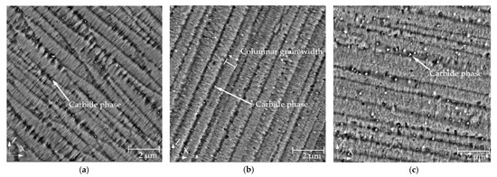 Figure 5 contains enlarged microstructure images that were used to measure the width of columnar grains. The columnar grain width is also shown in Figure 6b. Enlarged SEM images were taken near the upper and bottom surfaces of the etched BCM specimens. No clear differences were detected in the upper and bottom locations. Therefore, the mean values were used. Measured data showed that the preheating temperature leads to wider columnar grains. The mean columnar width increased from 0.71 ± 0.15 μm when RT was used as a preheating temperature to 0.75 ± 0.11 μm for 200 °C and to 0.82 ± 0.07 μm for 400 °C (Figure 7b).