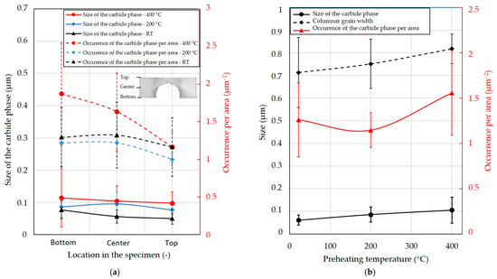 The size of the carbide phase decreased in the case of preheating at 400 °C from 0.114 ± 0.091 μm at the bottom to 0.097 ± 0.035 μm at the top, which is a decrease of 14.6%. In case of preheating at 200 °C, the size of the carbide phase decreased from 0.086 ± 0.033 μm at the bottom to 0.077 ± 0.030 μm at the top, which is a decrease of 11.0%. The largest decrease in the size of the carbide phase was observed at RT. In that case, the decrease was about 35.2% from 0.077 ± 0.027 μm at the bottom to 0.050 ± 0.017 μm at the top.