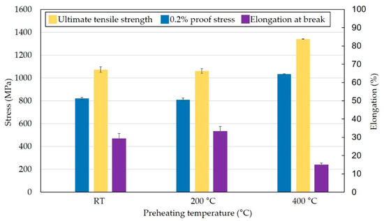 The tensile test showed an increase in 0.2% proof stress and ultimate tensile strength by 26% and 25%, respectively, while elongation at break was reduced by 48.8% when comparing RT and preheating at 400 °C (Figure 8). However, the tensile properties were studied in specimens fabricated in horizontal direction. Vertically fabricated specimens can exhibit different behavior when mechanical properties depend on microstructure, which in LPBF technology is strongly influenced by building direction.