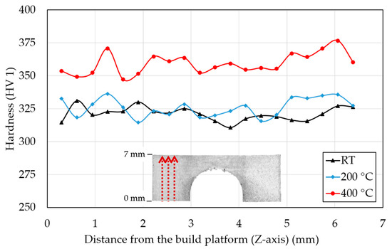 Figure 9 shows the mean of measured hardness values in the three lines in the direction of the Z-axis on the BCM specimens. Specimens that were fabricated at RT and preheated to 200 °C showed very similar hardness values that in the mean value was 321 ± 26 HV 1 and 326 ± 19 HV 1. The specimen with the base plate preheated at 400 °C had a significantly higher mean hardness value of 359 ± 22.5 HV 1 that is an increase of 11.8% compared to RT. The hardness values had an approximately constant character measured on the Z-axis (building direction). However, the hardness near the top surface increased for all BCM specimens.
