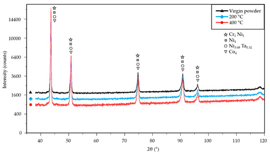 XRD analysis of the IN939 unfused powder in the three conditions: unused virgin powder, powder used at 200 °C, and powder used at 400 °C.