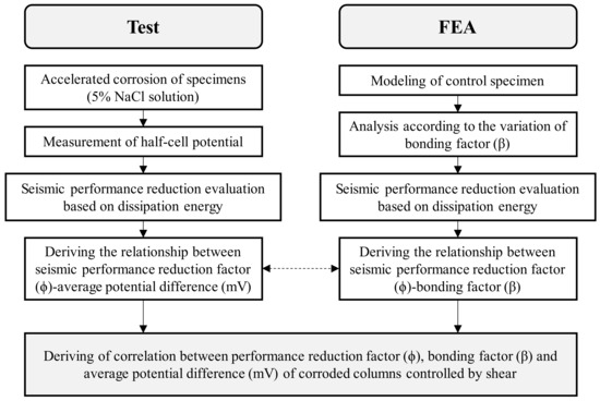 As shown in Figure 5, this study performed cyclic loading tests on columns of the shear failure type having reinforcement corrosion to examine the correlation between HCP before and after corrosion and seismic performance deterioration. At the same time, FEA was carried out in consideration of the weakened bonding between steel and concrete, in order to analyze the correlation between structural performance deterioration before and after corrosion of shear columns. Through a comparison of the experimental findings and FEA results, this study proposed a seismic performance reduction factor in relation to the extent of corrosion of shear columns.