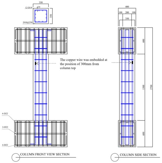 The SC-C0 specimen is a corrosion-free shear column that serves as a control, while the SC-C1, SC-C2, SC-C3, and SC-C4 specimens are corrosion-damaged specimens obtained by the impressed current technique. As shown in Figure 6, a copper wire was embedded at a height of 300 mm from the top of the column to accelerate corrosion.