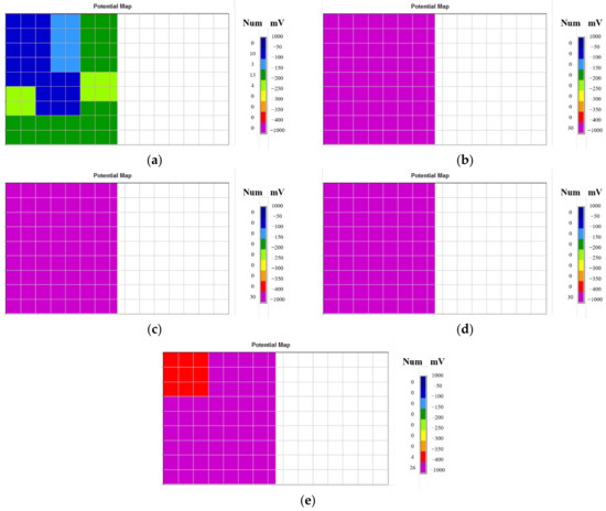 Potential maps of shear-controlled columns: (a) SC-C0 (−125 mV), (b) SC-C1 (−405 mV), (c) SC-C2 (−545 mV), (d), SC-C3 (−575 mV), and (e) SC-C4 (−605 mV).