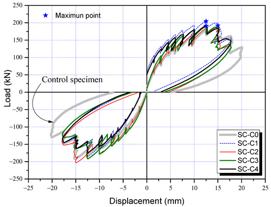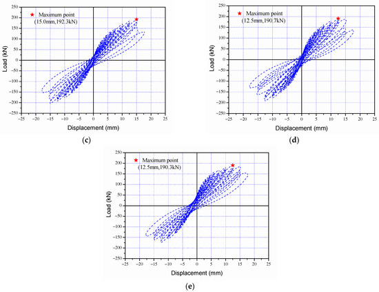 Load and displacement curves of column specimens following the cyclic loading tests: (a) SC-C0 specimen, (b) SC-C1 specimen, (c) SC-C2 specimen, (d) SC-C3 specimen, and (e) SC-C4 specimen.