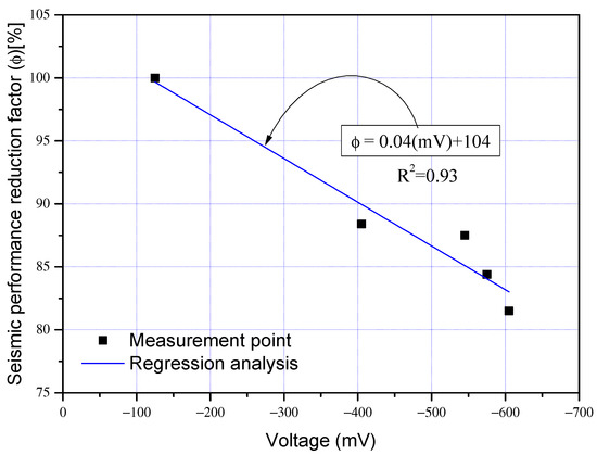 The dissipation energy of each specimen presented in Table 4 is closely related to the seismic performance reduction factor defined in Equation (1) and indicates that the reduction factor is decreasing in relation to the extent of corrosion (HCP). As shown in Figure 14, a strong correlation of R2 = 0.93 was found between the seismic performance reduction factor and the average potential difference of corrosion-damaged column members. Equation (2), based on regression analysis, can be used to obtain approximate values of mV and ϕ of shear failure-type column specimens.