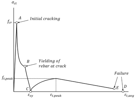 Here, = average tensile stress of concrete, = peak average tensile stress of concrete after reinforcement yielding (), , = peak tensile strain of reinforced concrete (), = average tensile strain of reinforced concrete, = yield strain, = with consideration of , , = cracking strain of concrete, = yield strength of steel reinforcement.