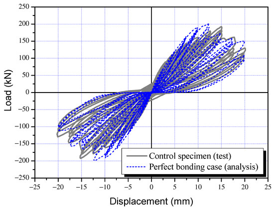 Figure 21 compares the experimental results (SC-C0) and FEA results (Case-1,) of the control specimen. Table 5 presents the results of the analysis carried out using 13 variables with as a reference and up to 0.0. The ultimate load of the control specimen was found to be 202.9 kN (Table 6), which is about 105% of the experimental value of 192.4 kN (Table 3). The ultimate displacement at this point was 12.5 mm in the analysis, about 83% of the experimental value of 15.0 mm. The dissipation energy was found to be 2105.9 kN-m, which is highly similar to the experimental value of 2106.7 kN. The analysis results using VecTor2 were consistent with experimental observations. The proposed FEA model can be seen as effective in examining the effects of weakened bonding on structural performance reduction based on strength-deformability, that is, the correlation between bonding factor (β) and seismic performance reduction factor (ϕ).