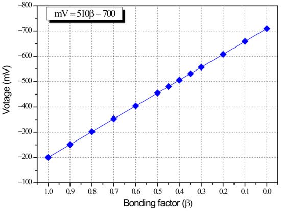 Relationship between bonding factor (β) and shear column specimen average potential difference in terms of voltage (mV).