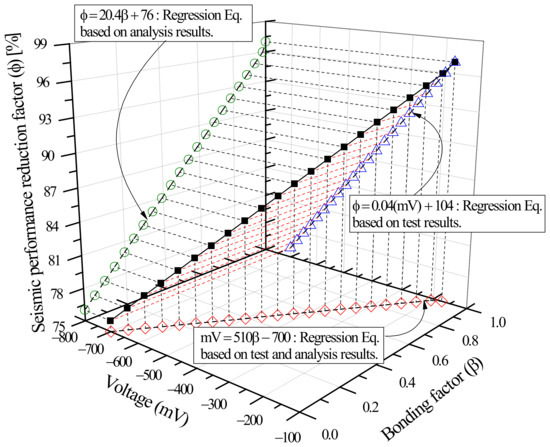 Using the FEA model for concrete and steel reinforcement described in Section 4, this study determined the effects of weakened bonding caused by reinforcement corrosion on strength-deformability, that is, the correlation between bonding factor (β) and structural performance reduction factor (ϕ) as shown in Figure 22. This section compares the β–ϕ correlation to the mV–ϕ correlation in Figure 14, that is, the relationship between the average potential difference measured by HCP and the seismic performance reduction factor obtained through experiments and proposes mV–β–ϕ interactions of shear columns.
