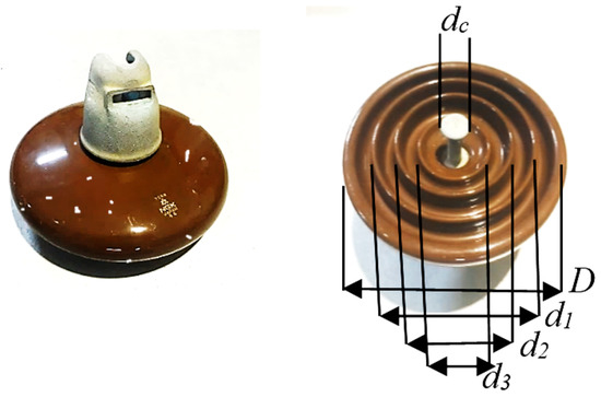 The porcelain insulators to be tested were collected from the transmission division of the national network in Malaysia. The selected insulators’ main shape is portrayed in Figure 1. The insulators’ actual specifications are tabulated as in Table 1. In this paper, a single disk of porcelain insulators and a string of three units of porcelain insulators were tested.