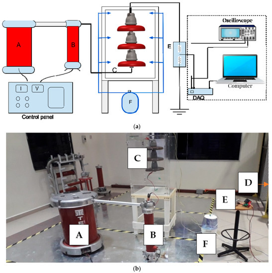 The IEC-507 standard, namely, “Artificial pollution tests on high-voltage ceramic and glass insulators to be used on AC systems” [36] was referred to while performing the experimental setup. All experiments were carried out in an artificial test chamber with dimensions 50 cm × 50 cm × 75 cm in which the walls were polycarbonate sheets. The chamber was installed with four inlet valves used for spraying insulators under test for the purpose of wetting. Figure 2a shows a schematic diagram for the high-voltage polluted insulator experimental setup. A photograph of the test setup and the equipment used in the high-voltage laboratory is given in Figure 2b. The experimental circuit setup was composed of the following components: A is a transformer (220 V/100 kV, 5 kVA, 50 Hz), B is a capacitive voltage divider, C is the test sample inside the chamber, D is a monitoring system to measure the leakage current, E is a resistive step-down divider (100:1) employed for the measurement of the LC and protection of the DAQ device, and F is a fog generator with a rate controller for wetting.