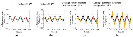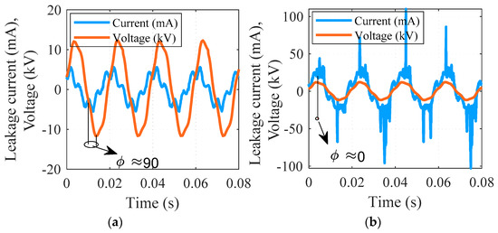 Figure 3 illustrates how the phase difference ϕ between the applied voltage and LC can be determined for a clean and a polluted insulator. For a clean insulator, the phase difference ϕ between the applied voltage and LC appeared to be nearly 90° (see Figure 3a). As the amount of pollution on the insulator increased, the phase difference ϕ between the applied voltage and LC decreased. Under heavily polluted circumstances, the phase difference ϕ between the applied voltage and LC became nearly zero (see Figure 3b).
