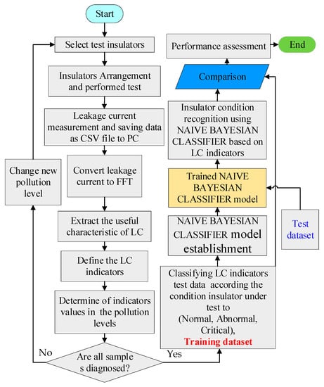 The naïve Bayesian classifier is a classification algorithm based on Bayes’s theorem. Its underlying idea and building approach are more straightforward and simpler than those of support vector machines and neural networks. Furthermore, compared to other algorithms, the naïve Bayesian classifier algorithm suits the approach of this work, and brought great accuracy in classifying the insulator situations. The naïve Bayesian classifier theorem, which is employed in the classification of the suggested LC indicators, is explained in this section. Figure 5 depicts the flowchart of the procedures involved in extracting and categorizing the recommended indicators.