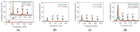 The frequency-domain signals of LC for polluted insulators have characteristic features at frequencies below 500 Hz. In this paper, the odd harmonic and total harmonic distortion (THD) of LC under 500 Hz were used to propose indicators for insulator condition assessment. The frequency characteristics of the LC are defined by the x5 and x6 indicators, as in Equations (13) and (14), respectively: