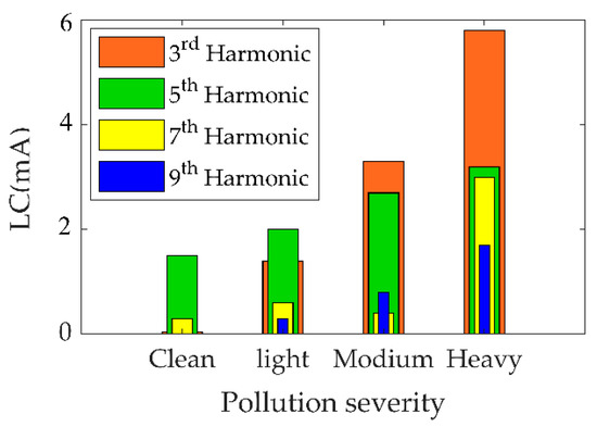 The LC findings of uniformly polluted insulators in both time and frequency domains with various SDD levels but fixed NSDD of 0.15 mg/cm2 and Wt of 3 mL/h are shown in Figure 6 and Figure 7. Figure 6 indicates that increased pollution severity causes a considerable rise in LC under specific values of NSDD, Wt, and Pu/PL. The LC increase can be explained by the increase in conductivity of the pollution layer on the insulator’s surface once subjected to wetness. Consequently, the LC flowed from the high voltage terminal to the ground in the form of positively and negatively charged ions. Some spot arcs were observed on occasion under high-contamination conditions, particularly in the existence of moisture. During the flashover, the signal of the LC appeared to be severely distorted, as shown in Figure 6d. Furthermore, when LC increased, the THD and harmonic values increased (see Figure 7), while the phase angle between the current and voltage decreased. The decrease in phase angle between the LC and voltage is due to the resistive current increasing with constant capacitive current. Once the contamination level on the insulator surface was raised, a clear change in the odd harmonics (3rd, 5th, 7th, and 9th) was observed (see Figure 7). As seen in Figure 8, the 3rd harmonic will increase to surpass the 5th, 7th, and 9th harmonics, with a clear increase in the 7th and 9th harmonics. Furthermore, during discharge activity on the insulator’s surface, the 3rd harmonic is often substantially high [44,45].
