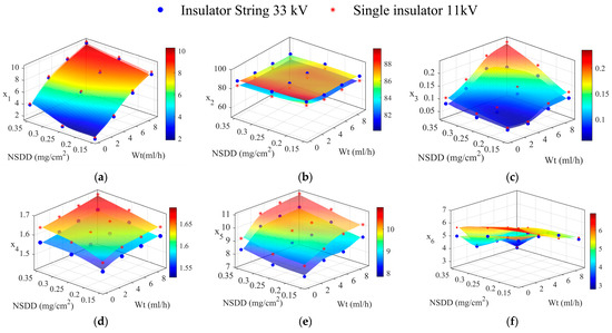 Figure 9 shows the LC indices of a clean (0.00 mg/cm2 of SDD) insulator under different Wt and NSDD. Each indicator demonstrates a unique behavior when the wetting rate and NSDD were changed. Of note, there is no significant difference between different NSDD under the same Wt. The x1, x3, x4, and x5 indices increased with the rise in both the NSDD and Wt. For example, when the Wt was increased from 3 mL/h to 9 mL/h under 0.15 mg/cm2 of NSDD, the x1 increased from 4.2 to 8.88, x3 increased from 0.065 to 0.11, x4 increased from 1.56 to 1.585, and x5 increased from 7.6 to 10.49.