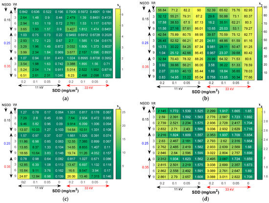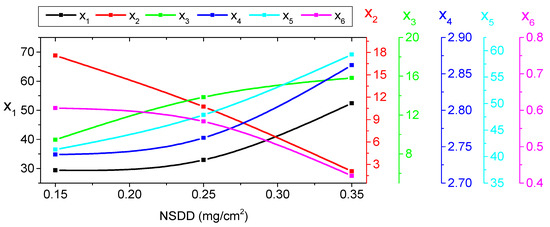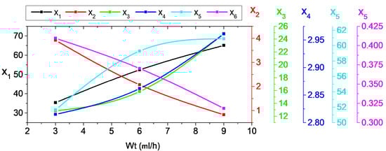 In contrast, the x2 and x6 decreased with the increase in both the Wt and NSDD. For example, when the Wt increased from 3 mL/h to 9 mL/h under NSDD = 0.15 mg/cm2, the x2 decreased from 87.2 to 86.01 and x6 decreased from 5.9 to 4.7.