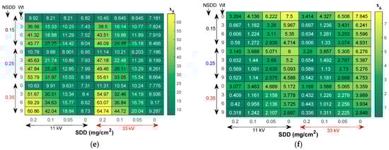 The leakage current indices x1, x3, x4, and x5 under different SDD, NSDD, Wt, and Pu/PL for single and string insulators are presented in Figure 10 and Table 4. The LC indicators of insulators under test increased with the increase in SDD under specific NSDD, Wt, and Pu/PL. On the contrary, the indices x2 and x6 of insulators decreased with the increase in SDD under the same conditions. For example, under NSDD of 0.25 mg/cm2, Wt of 6 mL/h and Pu/PL of 1/3, when SDD was 0.05, 0.1 and 0.2 mg/cm2, the x1 for the single disk insulator corresponded to 12.2, 15.4, and 26.6 mA, respectively. The x1 also increased by 26.2% and 118.03% when the SDD increased from 0.05 to 0.1 mg/cm2 and from 0.1 to 0.2 mg/cm2, respectively. For x6, when the SDD was 0.05, 0.1 and 0.2 mg/cm2, x6 corresponded to 2.69, 1.31, and 0.63 mA, respectively. The LC indicators showed a similar trend and performance for the insulator string under 33 kV with minor variations, as illustrated in Table 5.