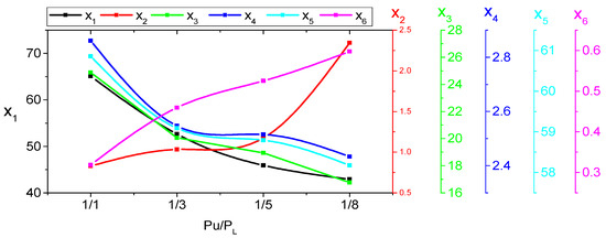The relationship between proposed indices x1–x6 and nonuniform pollution distribution Pu/PL for a polluted porcelain insulator under SDD of 0.2 mg/cm2, NSDD of 0.35 mg/cm2, and Wt of 9 mL/h and different Pu/PL as an example is shown in Figure 13. It can be observed that an increase in Pu/PL causes an increase in the x2 and x6 and a decrease in the x1, x3, x4, and x5. This means that the sample under uniform contamination conditions is more dangerous in terms of flashover incidence than the sample under nonuniform pollution levels.