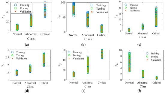 To develop a statistical technique for identifying diagnostic indicator borders based on the x1, x2, x3, x4, x5, and x6 inputs, the naïve Bayes classification algorithm [46] was trained with the experimental data to predict the insulator’s state. In this study, MATLAB’s Deep Learning Toolbox was employed to develop the classification model. In the classification procedure, 952 data sets for each indicator were used in the classification process using the naïve Bayes classifier algorithm, where 70% of the data (666 data) were chosen for the model training, 15% of the data (143 data) were utilized for the model performance verification, and the other 15% of the data (143 data) were selected for the model testing, as shown in Figure 14. The boundary classification results of indicators x1, x2, x3, x4, x5, and x6 based on naïve Bayes classification are also shown in Figure 14.