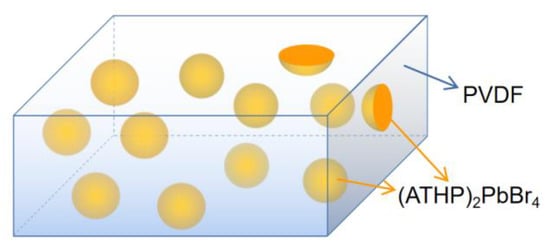 - The filtered (ATHP)2PbBr4 precursor solution was added to the already-stirred PVDF colloidal solution, the mixture was heated and stirred for 3 h, and then the stirrer was switched off for heating only and left to stand overnight.