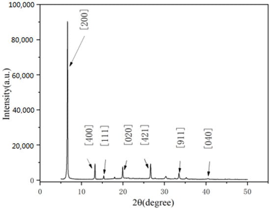 2. X-ray diffraction (XRD): Model D8 Focus, manufacturer Bruker, Germany (Branch in Beijing China). This test instrument was provided by the Institute of Physical and Chemical Technology, Chinese Academy of Sciences. The test was performed using a Cu target with a wavelength of 1.5406 Å; the scan 2θ range was 5–50°,and the scan speed was set to 0.1 deg/s.