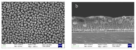 The accuracy of the material was determined by the above elemental analysis of the prepared films, based on which the annealed completed 0-3 piezoelectric films were characterized and analyzed. Figure 4 shows the 0-3 piezoelectric films annealed at 90 °C for 30 min at 500–1000 rpm. The top view shows that the distribution of the piezoelectric material is relatively uniform, the growth size is also relatively consistent, and all crystals grow in one direction. The thickness of the film is about 5 μm, and the piezoelectric materials are mostly distributed in the middle layer from the cross-section, which indicates that the piezoelectric materials are well dispersed in PVDF.