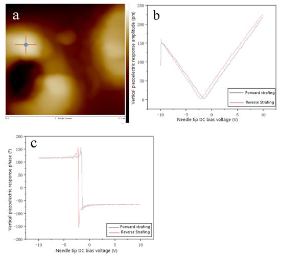 The piezoelectric response of the 0-3 type piezoelectric film was further investigated at an AC drive voltage frequency of 300 kHz, a DC bias voltage of −10 V, and an AC drive voltage of +5 V. Figure 5a–c show the perpendicular piezoelectric response hysteresis curves of 0-3 piezoelectric films. AFM high-resolution morphology maps were obtained using a piezoelectric microscope with a selected scanning area of 2 µm × 2 µm (Figure 5a). A point in the scanning area (blue point in Figure 5a) was selected for the PFM test, and the black curve indicates a change in tip scan bias from −10 V to +10 V, and the red curve indicates a change in tip scan bias from +10 V to −10 V. As shown in Figure 5b,c, it was found that the forward-scan and reverse sweep curves do not overlap. As seen in Figure 5b, the amplitude of the tip DC bias voltage of −10 V is smaller than that of +10 V. Moreover, the minimum point of the amplitude is moving to the left along the x-coordinate axis, and the maximum value of the amplitude is about 0.2 nm. This indicates that the spontaneous polarization direction of the 0-3 piezoelectric film is downward, and the polarization tendency inside the film is also downward in phase. The phase angle in Figure 5c is +115° when the tip bias voltage is −10 V and −65° at −10 V. The difference between the two is 180°, which exactly satisfies the flip angle of the ferroelectric domain and proves that the film is ferroelectric. In addition, the change of phase angle also satisfies the trend of polarization tendency inside the film, both downward, which is consistent with Figure 5b. Since the 0-3 piezoelectric film contains only about 25% of (ATHP)2PbBr4, and the thickness of the film is thick, the effective (ATHP)2PbBr4 content is not high, so the piezoelectric response amplitude is not high. The analysis of the phase diagram shows that the ferroelectric domains of the film are flipped nearly 180° and have a downward polarization tendency, indicating that the grain growth has the advantage of meritocratic orientation, which corresponds exactly to the XRD pattern of the previously studied 0-3 piezoelectric film (Figure 3), which is also a basis for the future study of the film polarization.