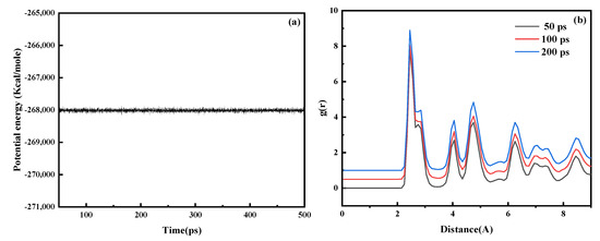The model established to explore the formation of iron oxides in the L-PBF process consisted of three parts: spherical metal powder, iron substrate, and oxygen molecules randomly distributed over the metal powder. The model was established in three steps. In the first step, an iron nanoparticle model with a radius r = 10 Å was established using LAMMPS [38,39] as powder particles. The second step involved using the conjugate gradient method to minimize the energy of the established iron nanoparticle model, which was relaxed at 300 K for 200 ps to obtain the surface structure with the lowest energy. The relaxation results are shown in Figure 1a,b. The system’s potential energy and Fe-Fe binary distribution function change with time demonstrated that a relaxation time of 200 ps was sufficient to stabilize the iron nanoparticle structure. The third step replicated the obtained iron nanoparticles 5 × 5 × 1 times in three directions. Finally, these powders were placed on a 120 Å × 120 Å × 10 Å iron substrate. When exploring the oxidation of iron atoms, to save computing resources and accelerate the reaction rate, a certain number of oxygen molecules were randomly distributed in the space 30 Å above the iron atoms. The established model is shown in Figure 2. Table 1 lists the structural details of the corresponding models.