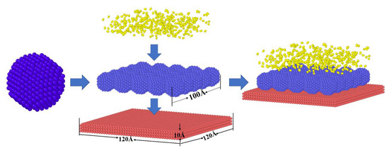 Molecular dynamics model of the L-PBF process. (Red represents substrate atoms, blue represents metal powder atomic particles, and yellow represents oxygen molecules.)