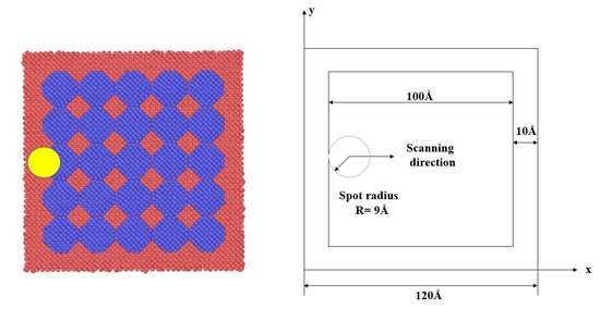 Lasers used in L-PBF technology are generally long-pulse continuous lasers, such as Nd: YAG lasers or fiber lasers. Long-pulse continuous lasers and ultra-short-pulse lasers interact with metallic materials via completely different mechanisms. The local temperature during the interaction with metallic materials is relatively low, which hardly induces the absorption of photons by electrons. Therefore, when studying the L-PBF process, we can only consider the effect of the heat generated by the laser beam on the model while ignoring the effects of electrons and phonons. In this simulation, the laser beam was loaded using the “fix heat” command in LAMMPS, which simulated the laser heating process by adding non-translational kinetic energy to the surrounding atoms through the laser spot. We assumed that the laser energy density conformed to a Gaussian distribution. The initial position and the scanning direction of the laser beam are shown in Figure 3. The center position of the laser light source was (10, 50).