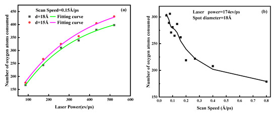 After the scan, the number of oxygen atoms with a charge of 0 should be counted, which is . Figure 10 shows the amount of oxygen consumed with time at different oxygen concentrations, where 0–55 ps was the laser scanning stage, and after 55 ps was the cooling stage. Oxidation mainly occurred during the laser scanning stage, and almost no oxidation occurred during the cooling stage.