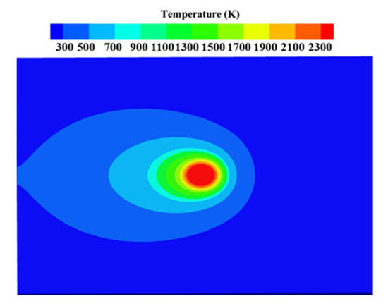 From Figure 6a, we can observe that the distribution of oxidation positions along the x direction was relatively uniform, and oxidation occurred along the laser scanning path (0, 100). In Figure 6b, the location of the laser melt path is marked with a red line. Oxidation concentrated at (41, 59) was located near the melt channel. This phenomenon has also been reported in ref. [45]. During the simulation, when the incident laser beam scanned the metal surface, most energy was absorbed by the powder particles, causing localized melting and forming a molten metal pool [44,46]. To study the phenomenon of oxidation concentration, the molten pool generated during the laser scanning process was simulated by finite element software. The simulation results are shown in Figure 7. There was a temperature gradient near the molten pool, which covered a range beyond the diameter of the laser spot. This phenomenon occurred due to thermal radiation from the powder layer and thermal conduction between powder particles. Therefore, the laser source that supplied energy to the powder layer not only generated a molten pool but also conducted heat near the molten pool. The area near the melt channel is called the heat-affected zone, and the oxidation concentration shown by the simulation results occurred in this area.