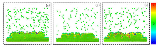 The trajectory files output by the LAMMPS calculation were post-processed and analyzed by Ovito. Figure 5a–c, respectively represent the arrangement state of each atom in the area before, during, and after laser scanning. Red atoms indicate oxidation. It can be observed that the oxidation of metal atoms was concentrated in the middle area. We believe that this oxidation phenomenon was related to the laser scanning weld. To further verify the connection between the oxidation and the laser scanning melt channel, we formed a relationship between the position of the oxidation atom and the x and y coordinates, as shown in Figure 6a,b.