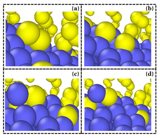 Figure 13 shows the adsorption and dissociation process of oxygen molecules during laser scanning. From an atomic perspective, the dissociation of oxygen molecules from the metal surface during the L-PBF process can be divided into two stages. In the first stage, oxygen molecules are rapidly adsorbed by the free surface of metal atoms, and then dissociated or partially ionized. The dissociated oxygen atoms reconstruct the surface by exchanging positions with metal atoms. In the second stage, Fe is activated after forming a chemical bond with O. Because of this, interactions with other metal atoms on the surface are weakened, allowing Fe atoms to potentially leave the surface.