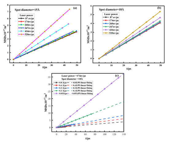 where is the diffusion coefficient of the system, is the total number of particles, is the time, and and are the positions of the particles at and , respectively. From Equation (8), the diffusion coefficient can be approximated as the ratio of the mean square displacement (MSD) to time. At a certain temperature, the diffusion coefficient is 1/6 times the slope of the atomic MSD curve. According to the results of oxidative diffusion, we made the MSD curve related to this paper, and the obtained results are shown in Figure 14a–c, which are the MSD curves under different spot diameters, different laser powers, and different scanning speeds.