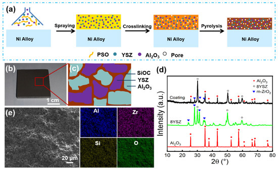 (a) Schematic illustration of preparation process of the SiOC/Al2O3/YSZ coatings, (b) photograph, (c) simulation of phase structure, (d) XRD patterns, (e) SEM image and elemental mappings of the SiOC/Al2O3/YSZ coating: blue for Al, purple for Zr, yellow for Si, and green for O.