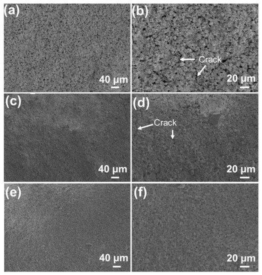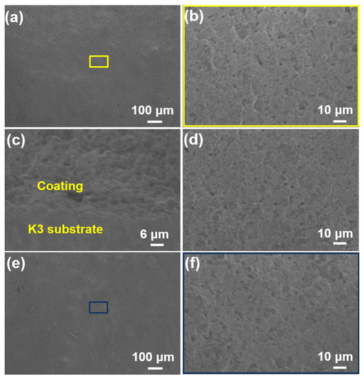 The SiOC/Al2O3/YSZ coatings were prepared by changing the mass fraction of the Al2O3 and YSZ fillers in the system (68 wt.%, 75 wt.%, and 79 wt.%). All coatings are well-combined with the K3 substrate without obvious macroscopic cracking, which is quite different from the pure SiOC coating, showing the alleviation effect of the introduction of Al2O3 and YSZ fillers on the volume shrinkage of the SiOC during the pyrolysis. However, under high-resolution SEM observation, some defects (e.g., pores and microcracks) inevitably appeared on the surface of the low-filler-loaded SiOC/Al2O3/YSZ coating, as shown in Figure 2a,b. The size and amount of the cracks decreased with the increased fillers’ fraction (Figure 2c,d). When the fraction of the fillers was increased to 79 wt.%, the cracks completely disappeared on the surface (Figure 2e,f), indicating that the stress caused by the SiOC shrinkage during the pyrolysis could be effectively reduced to the lowest level by adding enough fillers in the coating, which is similar to the filler-loaded bulky PDCs [20]. However, further increasing the fillers’ fraction would lead to a serious decrease in the strength of the SiOC/Al2O3/YSZ coating due to insufficient adhesion of the SiOC phase to the Al2O3 and YSZ fillers.