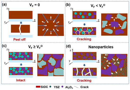 As for the coating system, the crack in the SiOC coating can also be mainly attributed to the fillers’ fraction of the bulky materials. According to our experiment, the optimal volume fraction of the fillers (donated as ) in the SiOC/Al2O3/YSZ coating is ~52 vol.%, which is less than of 74 vol.% in the bulk. The SiOC phase in the coating mainly distributes in the area among the fillers, and its scale and distribution state are closely related to the fillers’ fraction in the coating, further affecting the inhibitory effect on the SiOC shrinkage. The smaller and thinner the formed SiOC phase, the lower the shrinkage stress during the pyrolysis, which could effectively suppress the cracking of the coating. When 0 < VF < (Figure 5b), the SiOC phase is wholly connected with a large size, and then large stress generated by the shrinkage of the SiOC tends to result in cracking in the coating. When VF ≥ (Figure 5c), the SiOC phase gradually tends to form isolated islands in the coating or thin layers on the surface of the fillers, and then the stress is too small to form a crack in the coating. In addition, as shown in Figure 5d, the nano-fillers tend to distribute in the SiOC phase, and the large size of the SiOC phase would increase the thermal stress caused by the volume shrinkage during the pyrolysis. Therefore, the addition of nano-sized fillers into the SiOC/Al2O3/YSZ coating shows a weak inhibitory effect on the cracking (Figure 3h,i).