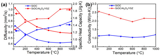 Thermal properties of the SiOC ceramic and the SiOC/Al2O3/YSZ ceramic as a function of temperature: (a) thermal diffusivity and specific heat capacity, (b) thermal conductivity.