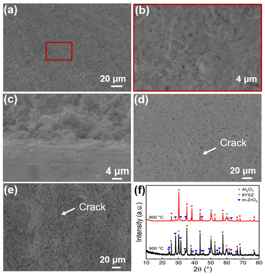 SEM images of the SiOC/Al2O3/YSZ coatings after thermal shock test: (a–c) after 6 cycles during 800 °C-RT: (a) and (b) surface-section, (c) cross-section; (d) after 7 cycles during 800 °C-RT; (e) after 1 cycle during 900 °C-RT; and (f) XRD patterns of SiOC/Al2O3/YSZ coatings after thermal shock test during 800 °C-RT and 900 °C-RT after 6 cycles.