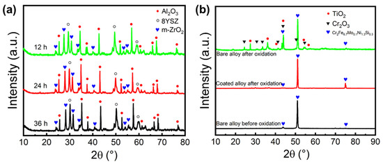 XRD patterns of (a) the SiOC/Al2O3/YSZ coatings after oxidation test at 1000 °C for 12 h, 24 h, and 36 h, and (b) the K3 alloy substrate with and without the coating after oxidation test at 1000 °C for 36 h.