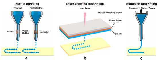Common 3D bioprinting techniques: (a) inkjet bioprinting, (b) laser-assisted bioprinting (LAB) and (c) extrusion bioprinting [24].