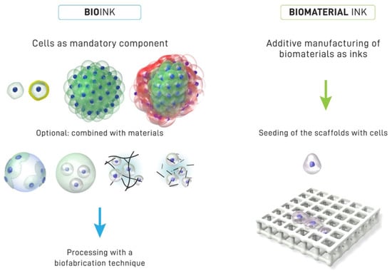 The characteristics distinction between bioink and biomaterial ink. In a bioink, cells are the mandatory component of the printing formulation, which can be in the form of single cells, coated cells and cell aggregates (one or several type of cells). The bioink may contain biomaterials and biologically active components. Meanwhile, the biomaterial ink is where the seeding cells are introduced within biomaterial scaffolds after printing. Reproduced with permission [25]. Copyright 2018 IOP publishing under a Creative Commons Attribution 3.0 Unported (CC BY 3.0). https://creativecommons.org/licenses/by/3.0/ (accessed on 21 August 2022).